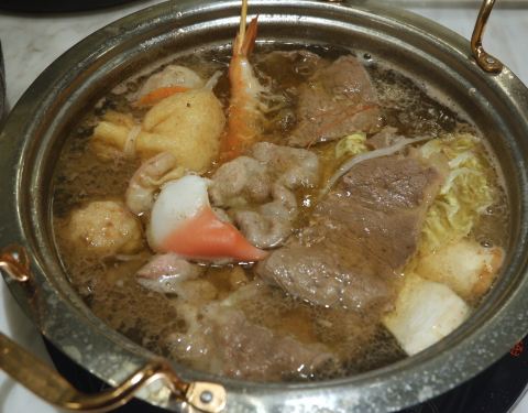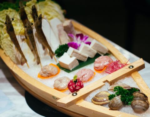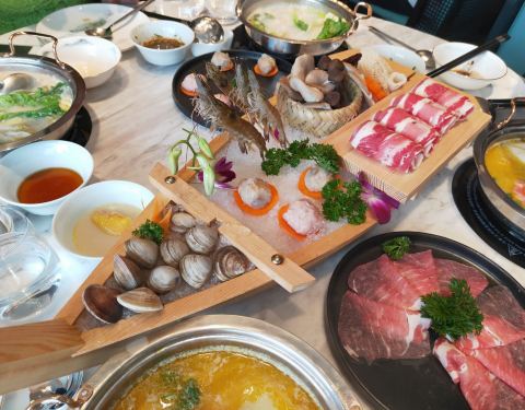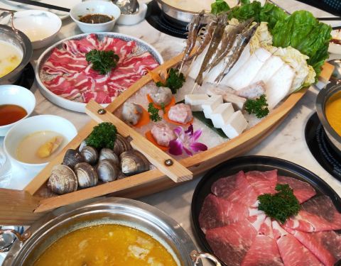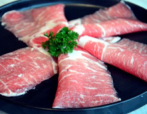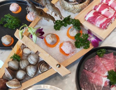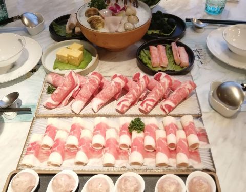- ●肩胛牛小排、至尊三间肥牛、沙朗猪肉,品质佳,口感棒,虾滑滑嫩,福袋Q爽,再来个蔬菜拼盘,完美