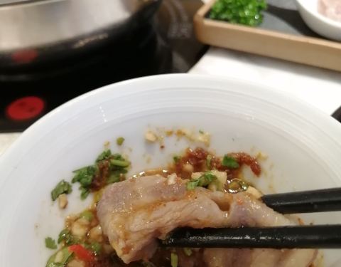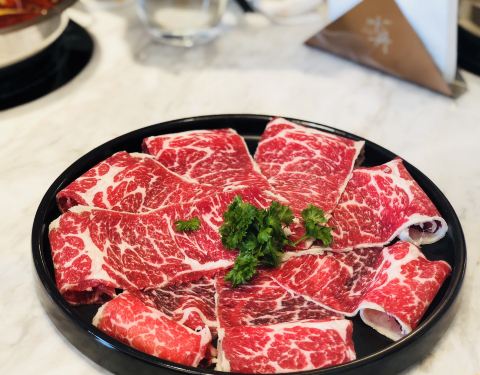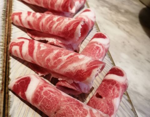 ...个人的喜好任意煮,锅底选上沙蚬汤,至尊三间肥牛、香草有机沙朗猪,肉的质量不错,纹理清晰,很新鲜