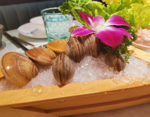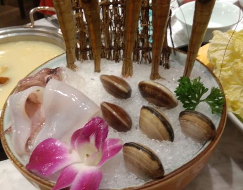 中华城宝藏火锅,拥有落地窗、在《千门口里江山图》画卷动画很有特色,在这里闺蜜闲聊,那可是相当的低调惬意。入座后先送上餐前水果,鲜甜的哈密瓜和小番茄。一人一小火锅的形式,最喜欢这样的小火锅可以根据个人的喜好任意煮,锅底选上沙蚬汤,至尊三间肥牛、香草有机沙朗猪,肉的质量不错,纹理清晰,很新鲜。放进火锅里煮一煮,就可以品尝到鲜嫩Q弹,很有嚼劲的肉片,大口吃肉的超棒。当然海鲜也是不可错过,当季鲜贝活造拼盘,新鲜看得见,虾可是活跳跳的呀。