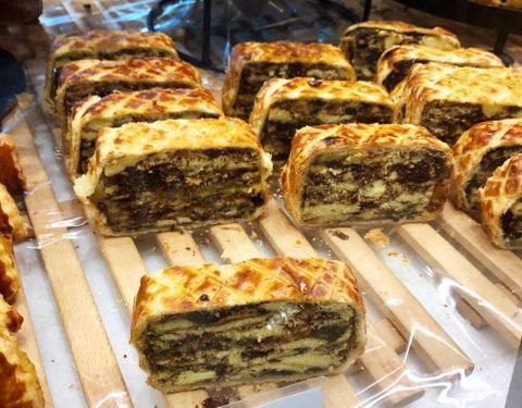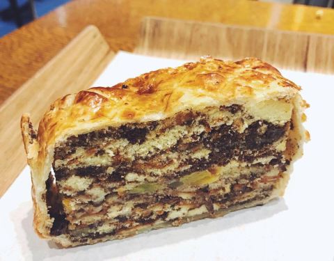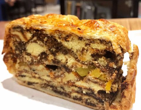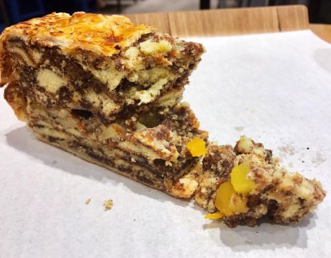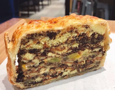 外皮是非常薄、脆的派皮,内里是层次丰富的蛋糕,蛋糕体很绵软扎实,有很大颗的水果粒,甜度三颗半星刚刚好