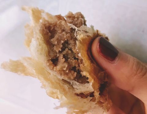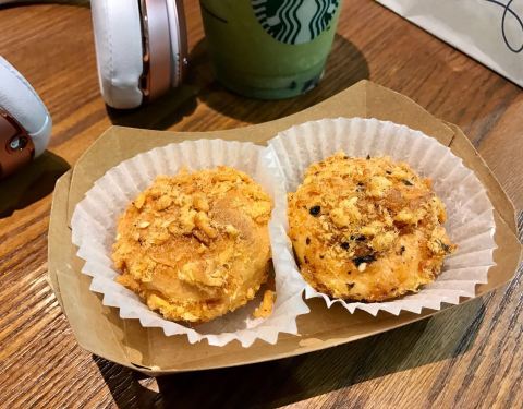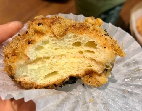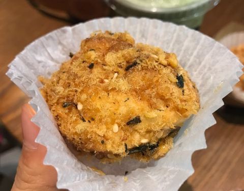 路过巴黎贝甜时看到上新了一款形似肉松小贝的点心,品名叫“肉松球球”,分两颗,一颗是海苔口味,另一颗是蟹黄口味,介绍上说是“儿时的味道”,文案还挺走心~ 确实是肉松球球...乒乓球大小,半口没啊~内里酱很少很少,海苔是脆海苔,但是蟹黄那颗讲真真的没有蟹黄味儿...相较十块钱两口的价格,性价比比较低啦...