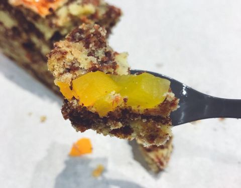 - 外皮是非常薄、脆的派皮,内里是层次丰富的蛋糕,蛋糕体很绵软扎实,有很大颗的水果粒,甜度三颗半星刚刚好