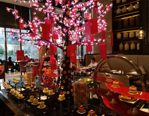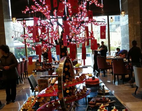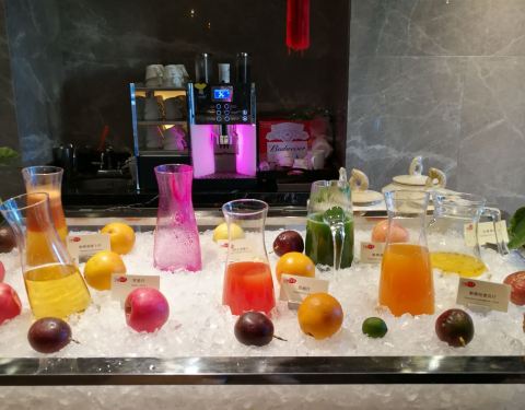 去它家吃自助餐,因为买了含大堂吧饮品的套餐券,所以提前去小坐一下。大堂吧地方不算大,装修的时尚华贵,氛围安静优雅,服务员很热情,不过之前宣传的除了含酒精饮料外,可任意消费,也变成了只有果汁,而且不是鲜榨的。这里甜点挺多,价格自然也偏高,看了下菜单咖啡,茶水,酒水也比一般小店高,主要胜在环境好,不喜欢像星巴克之类吵闹的可以来这里。