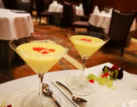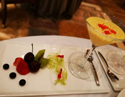 万豪轩就是重庆万豪酒店的中餐馆,老重庆宾馆的位置重新建造的,五星级宾馆的五楼,人少优雅非常高档。当天没预约到,第二天晚上终于如愿以偿。做粤菜做得好,清蒸鱼真的很厉害,蚝皇鲍鱼扣鹅掌味道鲜美,创新菜宫保虾仁很喜欢,杨枝甘露配四色水果养颜美容。这里的服务是按五星级酒店的标准管理,唯一不好的就是自带酒水需要开瓶费。