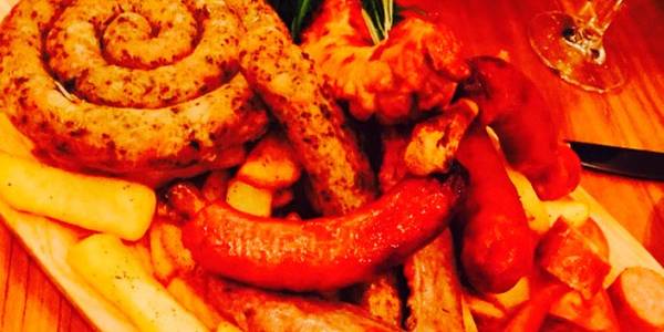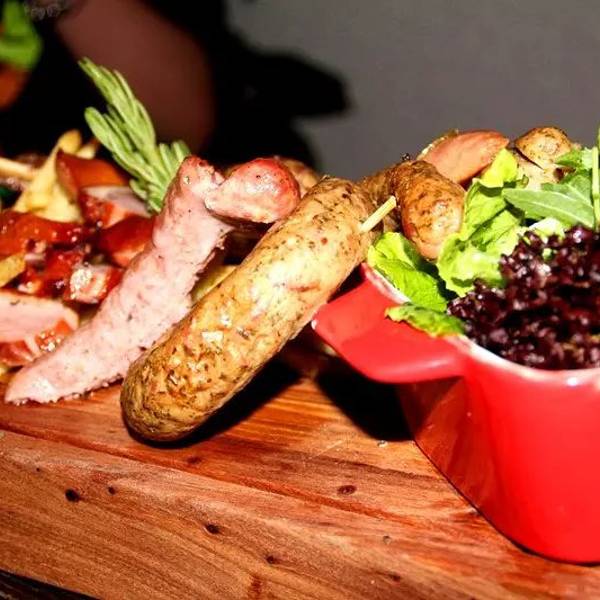 餐前酒的口感略带清新,他们家的黑醋和橄榄油是从大罐子里自己适量倒在餐盘里的,首先上来的是面疙瘩一样的土豆圆子,看来色面一般,吃起来根本停不下来,是这一餐最推荐的菜!起司拼盘搭配各种切薄的肉肠,不怕长膘的妹纸尽情吃,每一片面包上的起司都是不同的口味,很有选择性。肉类的拼盘分烤肠类和肋排类,烤肠盘的摆盘一般般,几种肠子的口味倒是口味各异,香嫩多汁,边上配着的薯条一定要趁热吃,即使不沾番茄酱也很香。另一个肋排+牛排的拼盘,小伙伴们的说法是褒贬不一的,摆盘没话说,但肋排的口味个人不算大爱吧。大赞的甜点是菠萝雪葩,好大个菠萝壳子加冰,也算是夏日里的一丝清凉。