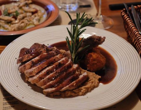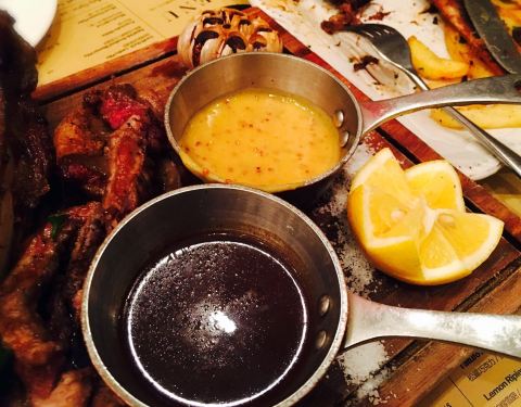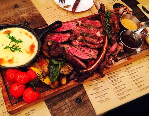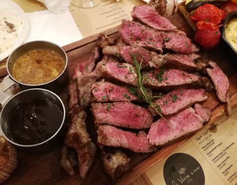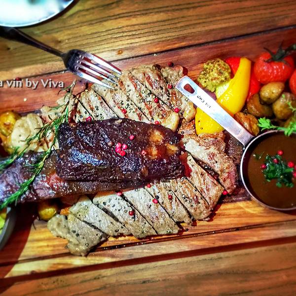 闹中取静的地方,装修很有特色,一定要预约。人多一定不能错过战斧牛排这一特色,1.3公斤的牛排,上桌很壮观,配了土豆泥,薯条蔬菜,肉都改刀切好了,蘸酱有多有种选择,满足不同口味。