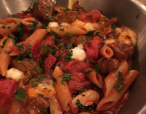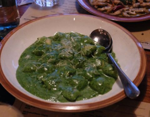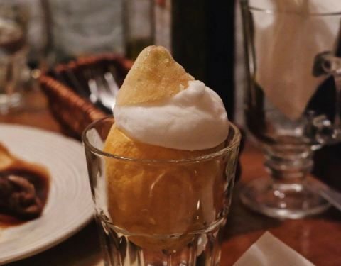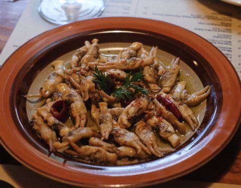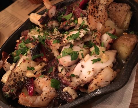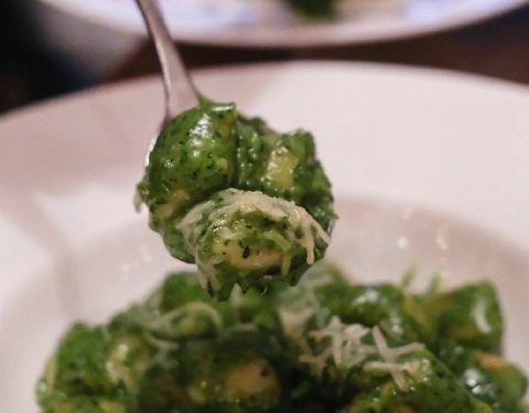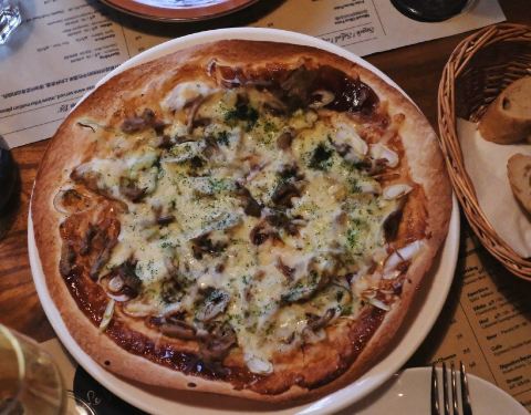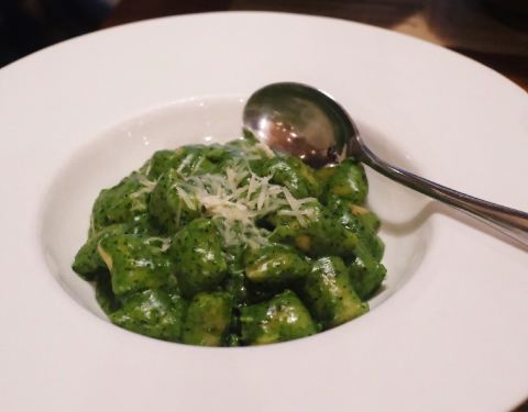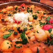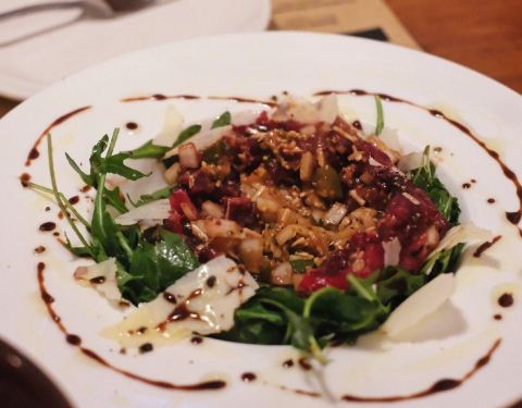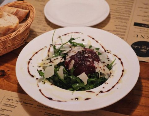 辣香肠煮蛤蜊 看名字就觉得很下酒,说是香肠,其实已经化成肉沫了,香味煮进番茄汤底中,又被吸收进蛤蜊里,成就了蛤蜊肉的鲜香。 生牛肉塔塔 与常见的牛肉塔塔不同,最外面裹了薄牛肉片,看起来像个肉团子。切开以后才发现里面除了牛肉块,还有洋葱和青椒。牛肉鲜甜软嫩,洋葱清甜爽脆,油醋加胡椒的调味简单却足够味美了。 蓝奶酪土豆面团 铁打不动要点的。这次酱汁有点少,稍微干了一点,虽然还是好吃的,但是容易腻。