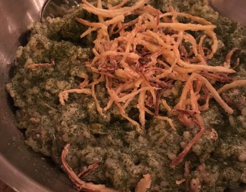 ...盘里的,首先上来的是面疙瘩一样的土豆圆子,看来色面一般,吃起来根本停不下来,是这一餐最推荐的菜