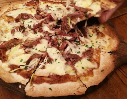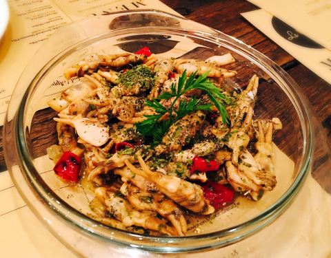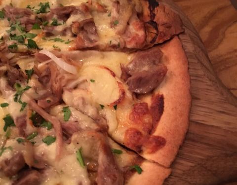 好个性有趣的一家小酒馆,天花板和墙上贴满了老板的毛笔字和涂涂画画,每一张字里行间都是老板的小幽默。一张张看过去,等餐也不会无聊。 油封鸭和京葱薄饼 极薄极脆的饼底,抹上自制“甜面酱”,铺满京葱丝和小块的油封鸭肉,然后盖上一层厚厚的芝士,神似北京烤鸭。怎么可能不香?怎么可能不好吃?不可能嘛! 腌蛏子 蛏子肉质鲜嫩,调味微酸微辣开胃下酒,和餐前面包很搭。 蓝奶酪土豆面团 浓郁稠厚的酱汁满满裹住每一个面团。糯唧唧有嚼劲的面团一口一个,里面还有cheese夹心。蓝纹奶酪的浓香霸道地占据味蕾,脑子里只剩一排排小面团在跳舞转圈圈。 煎猪排配栗子泥和栗子丸子 猪排有点老,栗子泥香甜可惜有点干,酱汁还不错,低于预期但是也不难吃。