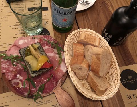 和朋友小聚 法餐爱好者预定好的这家 长乐路上环境小资的店还蛮多的 这家以意法菜为主 服务员推荐了四人套餐 刚好四个人么 点起来~ 关键是里面还有三瓶酒哦~ 气泡酒、红酒、甜酒各一瓶 前菜混合冷切火腿和香肠拼盘...