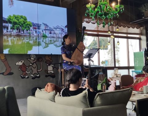 - 环境是非常不错的,傍山依水,非常适合休闲聊天的一个地方,下午还有评弹表演,美女阿姨很有气质,侃侃而谈
