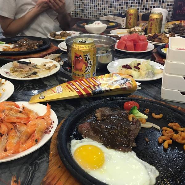 【环境】:环境干净整洁,灯光明亮,每桌都隔的比较开,拿餐品的走廊过道也非常宽敞,人多的时候避免碰撞,餐厅还会放一些令人愉悦的音乐,增加就餐的情调。牛排是这里最大的亮点,口味口感鲜嫩程度和外部几十一份的牛排没有任何的差别,而且这里还是随便吃,想要牛排的时候叫服务员过来就好了,这一份是黑椒汁的牛排,这里还有蘑菇汁、法式甜酱这样的口味,还可以选择五分熟和七分熟还有全熟,个人建议选择七分熟,五分熟可以见到血丝,全熟太硬。除了牛排还有一些小菜,都是一些湖南的口味,湖南的小菜,偏辣偏油腻。还有炒意面、炒饭、空心粉等这样的主食,不过像自助餐这样的餐厅很少有人会选择吃主食。整体的环境还是非常好的,灯光明亮,菜品都有保温的措施。这里的特色刺身,供应的量比较小,也放在寿司旁边毫不起眼的地方,所以很少有人会注意到,三文鱼和北极贝还是不错的,也很新鲜蘸上芥末别提有多爽了。白灼大虾也是不限量供应的,和它一起的还有口味虾和海参片,良心商家真是的在用心做餐饮。还有不限量的水果供应,种类比较多,除了图上的还有大量的西瓜,吃自助吃肉最好的配菜就是水果和沙拉,搭配着吃,不至于很油腻。烤生蚝和扇贝,每次每个人只能拿两个,味道一般都是蒜的味道,完全吃不吃海鲜或者生蚝的感觉,不过【tips】:20点以后餐厅基本就开始收拾东西了,所以要在晚上去的,最好在18点左右去。另外这里免费供应啤酒、白酒、红酒还有一罐一罐的加多宝凉茶。