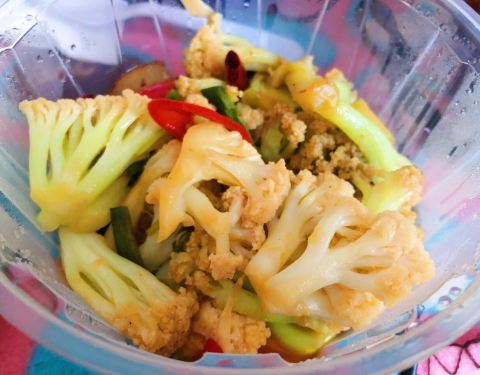 花菜炒的还不错,入味。失望。还是我点错了菜?外卖和堂吃差的有这么多嘛。 葱油饼一点葱香味都没
