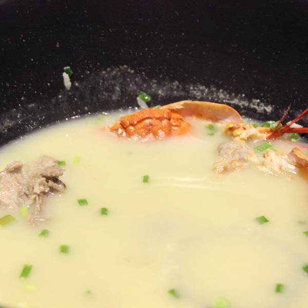 在这能吃到最新鲜、最原汁原味的海鲜大餐。餐厅采用一锅两吃的做法,上面蒸盘内蒸制海鲜菜品,下面熬制粥底。顾客可以先品尝美味的蒸海鲜,在这个过程中,蒸海鲜的汤汁滴入粥中,粥底沾染了海鲜的鲜甜,也就熬制得更加浓稠美味。
