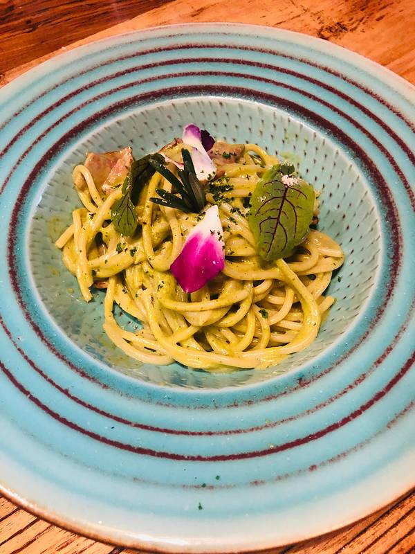 推荐罗勒鲜虾意面作为最招牌的一款,带着罗勒叶特殊的香味,青酱和奶油的味道浓郁,意面煮到恰到好处