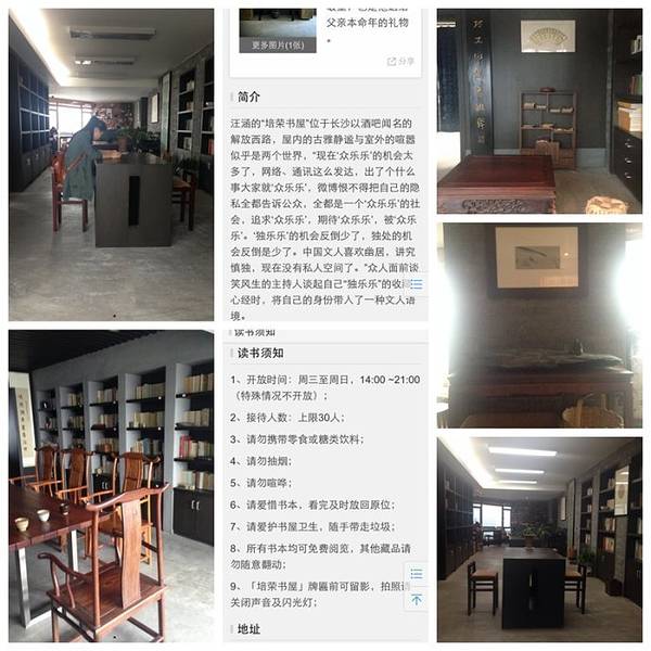 拥有一间自己的书屋,恐怕是中国自古以来读书人的一大理想。 2016年去长沙出差的空挡,我专门去拜访了汪涵送给父亲作为本命年礼物的培荣书屋。书屋不大,人也不算多,安静的氛围很容易让人进入书中的世界。书屋中...拥有一间自己的书屋,恐怕是中国自古以来读书人的一大理想。 2016年去长沙出差的空挡,我专门去拜访了汪涵送给父亲作为本命年礼物的培荣书屋。书屋不大,人也不算多,安静的氛围很容易让人进入书中的世界。书屋中既有我这样来去匆匆的游客,也有熟门熟路的本地人,找个舒服的角落,一个下午也只不过是一晃而过。书屋中的书籍以中国文化和历史为主,所有书籍均可免费阅读。 书屋位于长沙以酒吧闻名的解放西路,对面便是游人如织的太平老街,书屋内的古雅静谧与室外的喧嚣似乎是两个世界一般了。
