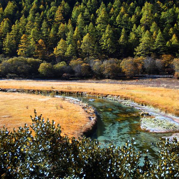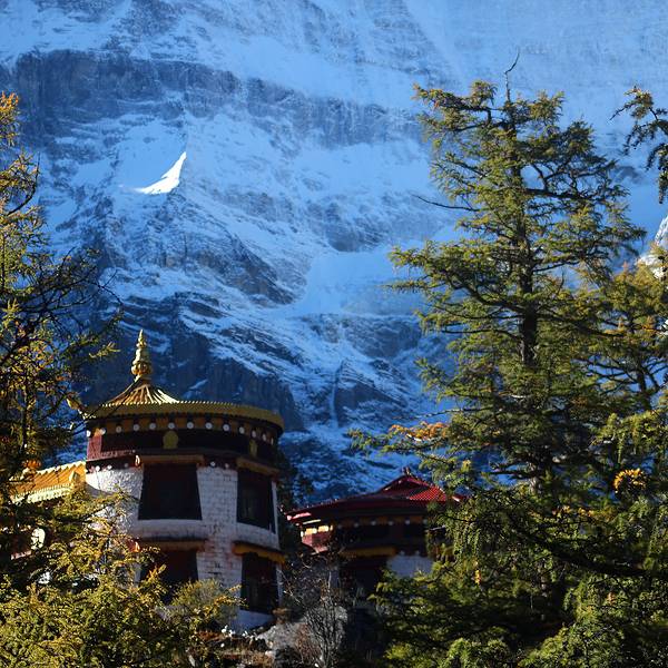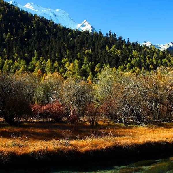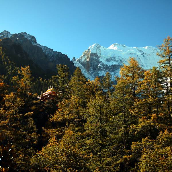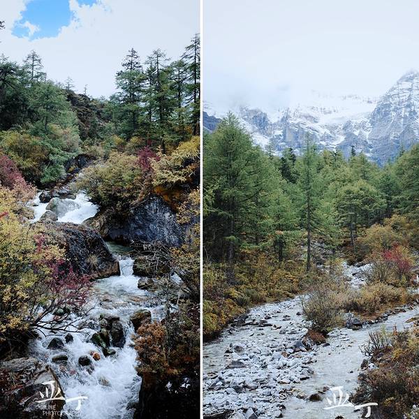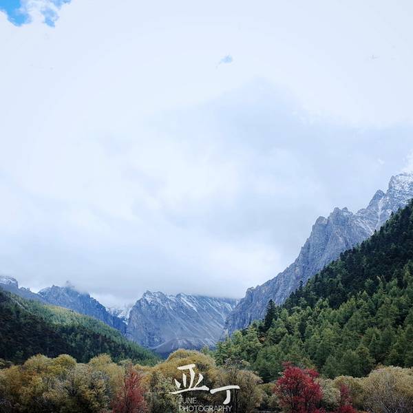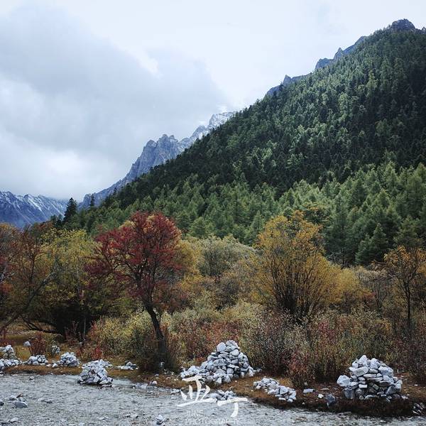 吃了早餐后,坐景区大巴到扎灌崩,这里是亚丁村转去洛绒牛场的中转站。 远处的央迈勇神山吃了早餐后,坐景区大巴到扎灌崩,这里是亚丁村转去洛绒牛场的中转站。这里可以看到仙乃日和冲古寺。远处的央迈勇神山树木开始转黄,而山水清冽。