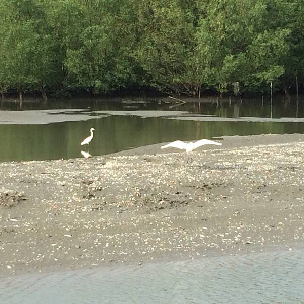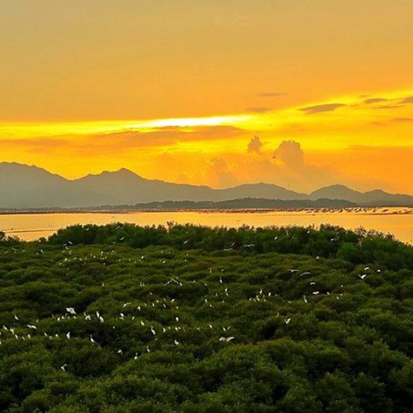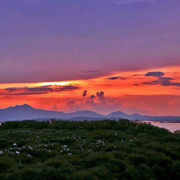 红树林每天都有三千到五千只候鸟在此活动,日落时分,在海滩沼泽地觅食的鹭鸟,全部缩着常常的脖子在红树林上空飞翔,盘旋几回后再飞回红树林。