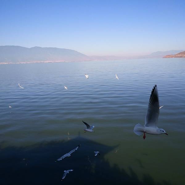 小的那种是私人的游船,只有一层,不够安全放心,有被宰的可能。洱海作为高原淡水湖泊,此时的水面平常平静,只有游轮驶过留下的波浪。听大理的人说,现在的洱海正在治理中,关闭了很多临海的客栈饭店之类的,为的是保全洱海的水质。环境需要靠大家的维护才能够长久维持,真希望每一位到洱海的人都要爱护这片纯净的海,不要往里面丢各种垃圾。早上?中午?傻傻分不清楚。静静看图,不说话,嘘……海鸥追逐着游轮,品尝着游人投过来的事物,为了吃到食物,也是需要很大的力气与勇气。手机相片拍不出洱海此时的美,唯有用眼睛记录着,脑子收藏着。若是年老以后,有能力在洱海边上拥有一幢属于自己的房子,多好!房子带个院子,种上喜欢的花草,养些鸡,狗等,此生无憾。不过以目前的能力来看,还是睡一觉吧,梦里什么都有。 展开