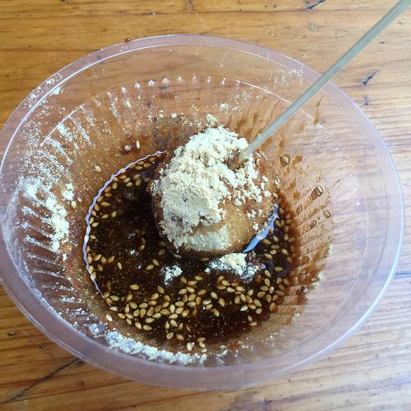 有点像糯米糍,表面撒上花生粉,加上下面咸咸的酱汁,口感还OK。 传说中的三大炮