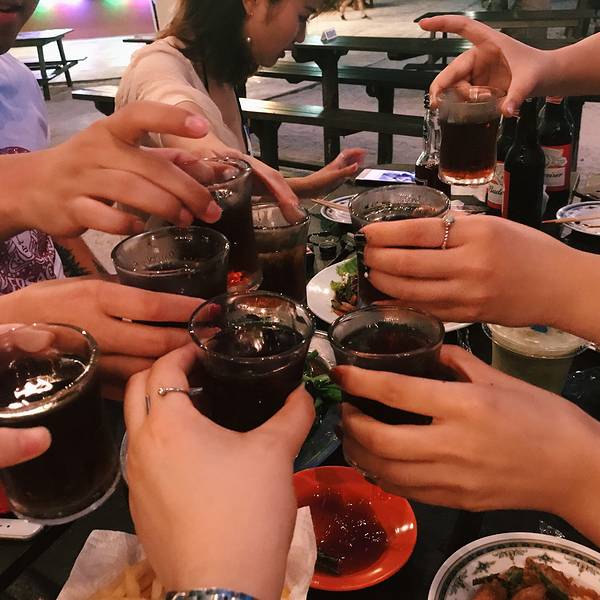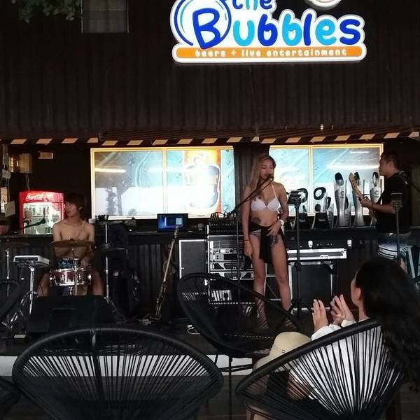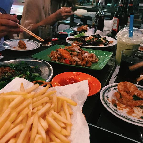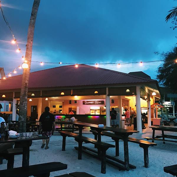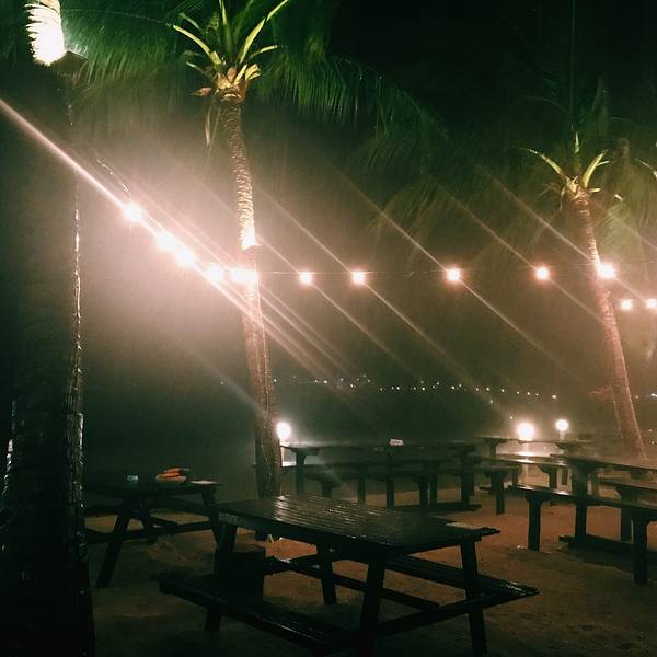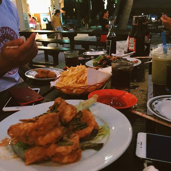 晚上去了岛上的一家 海鲜店 很多当地的特色海鲜[美人鱼][海虾]还有个又忘记了 ~拍了一个门头~炸薯条也很好吃 一个人吃了几乎一份 又来喝酒又点了一份结果吃着吃着就是大暴雨来袭 一群人围困在餐厅走不了 然后和朋友一起蹦迪 玩游戏 淋雨一直走~晚上随时都可以去游泳🏊酒店门口的小酒吧~每天都有驻唱
