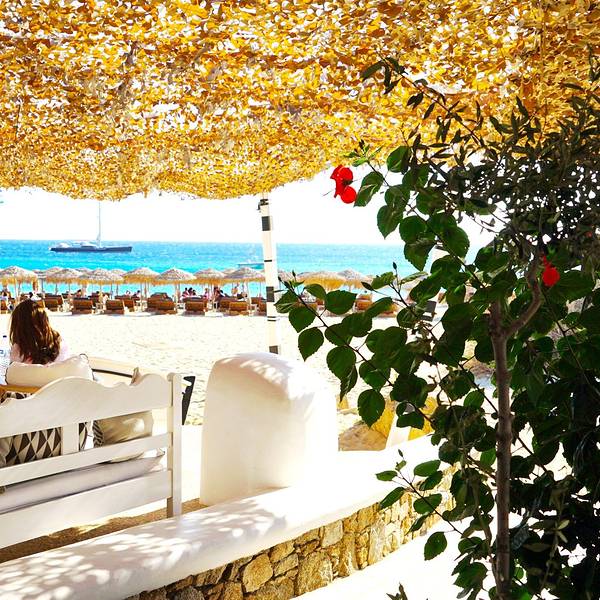 午餐选择了蓝旗海滩公路对面的一家名为Aquarius的餐厅,位置非常明显,很好找。虽然上餐很慢,等了足有半个多小时,一份猪排、一份海鲜面,味道非常不错,外加一大瓶水,一共44.8€。总之,对于来蓝旗的朋友们,还是非常推荐这一家。对于米克诺斯的海滩,我们听到的最多的应该是蓝旗、天堂和超级天堂海滩。抱着想去见识一下不一样的海滩,所以我们来到了Bay Elias。 Bay Elias,并不知名的海滩,国人鲜少知道,也没在游记里看到过此海滩的介绍,但当地人非常推荐,事实证明,Bay Elias真的很棒,不过水质没有蓝旗海滩的好。相比于蓝旗的清净,Bay Elias要热闹一些,配套设施也更加完善,聚集的人也多。当然,也就不会免费了。 收费标准:一组躺椅(两把)30€,不限时;如果购买饮品的话,15€便能享受一组躺椅,同样不限时。