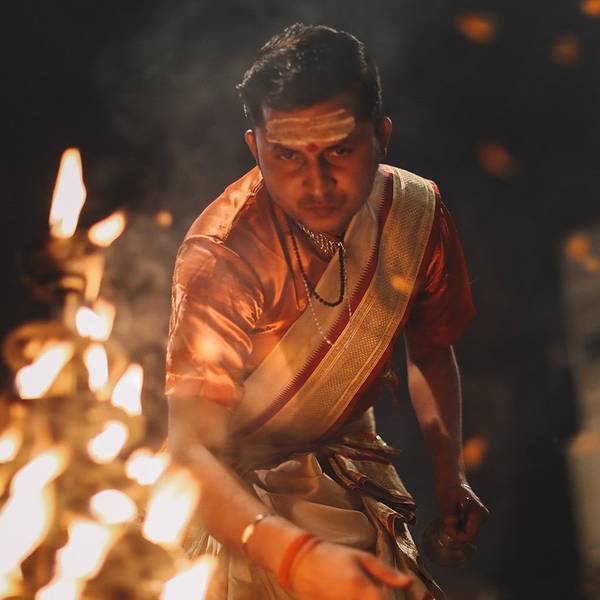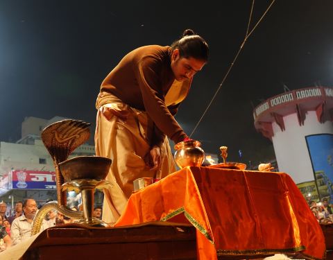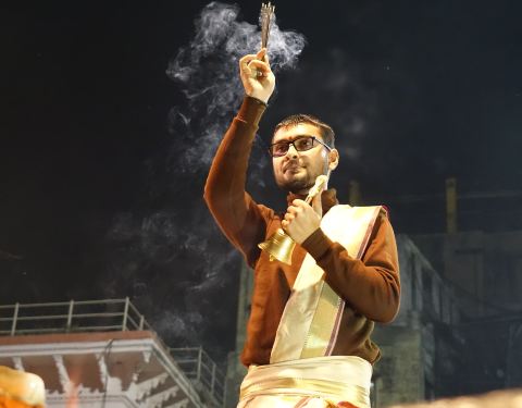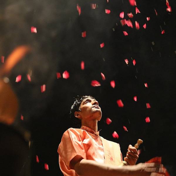 祭司们会先走到河边吟唱古印度的祭文,把花献入河中,再回到祭祀台,焚香,撒花、点燃宝塔法灯上传承了千年的圣火。随着手中的摇铃,低声吟唱,身边的印度人也会跟着小声吟诵。
