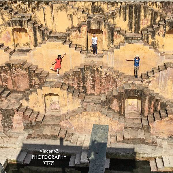 位于琥珀堡附近的阶梯水井是个不错的景点。一开始在琥珀堡被晒得有点晕头转向,下山后就坐车回城,半路经过水上宫殿才想起漏了。司机觉得让他白跑很不情愿,就说是很远很远的。我们说既然承包了你一整天让你去哪你就该去哪,后来哄哄他答应回程途中去一些购物点光顾一下他才无奈回头。其实阶梯水井离琥珀堡很近,在山脚底下的村子里头,当然也不建议走路,自己找可不好找。阶梯水井应该是印度比较特有的存在(如有不对请更正我),就好比一个倒挂插入地下的金字塔。阶梯拥有复杂的对称性,四面环绕沟通,由上而下由宽变窄,给人一种没有尽头的感觉,非常特别。拉贾斯坦邦偏干旱,井在雨季的时候可以收集水源供附近的居民用。不过这里的阶梯水井还算是小规模的,据说同在拉贾斯坦邦艾芭奈丽村的月亮水井更大更恢宏,光阶梯就有3500个。这次没能造访小有遗憾。