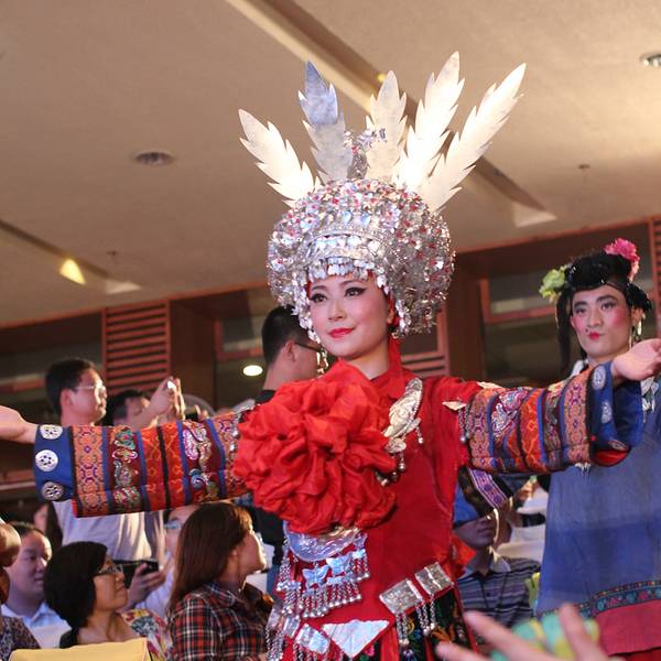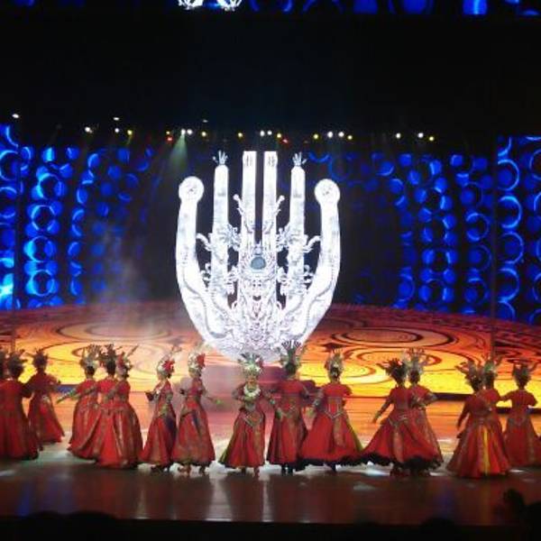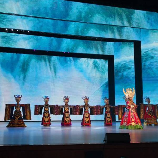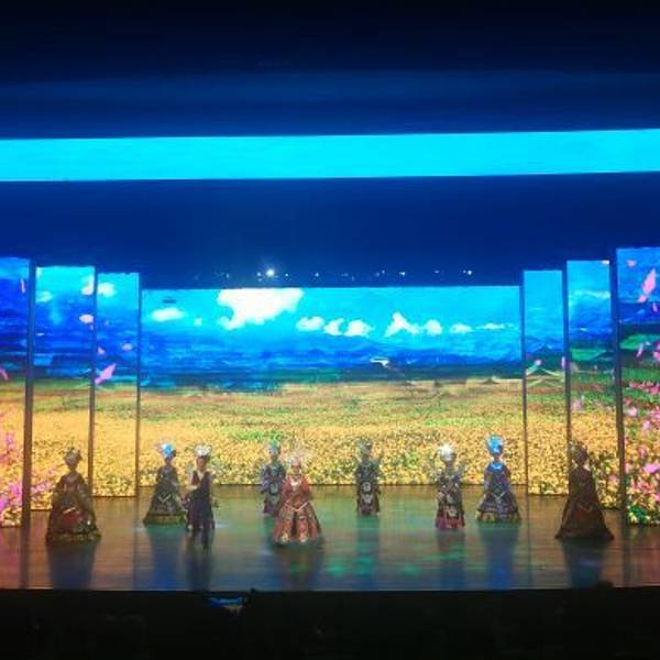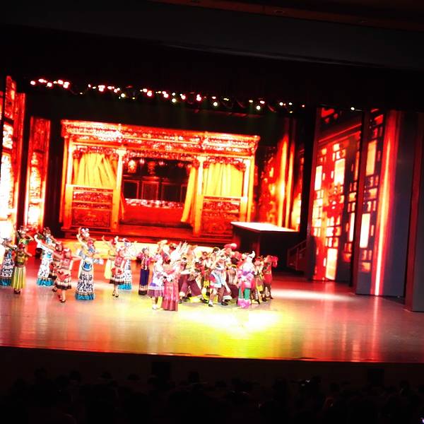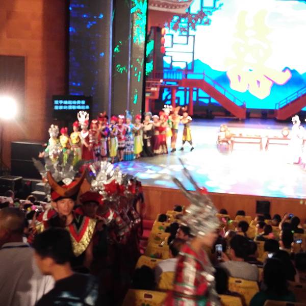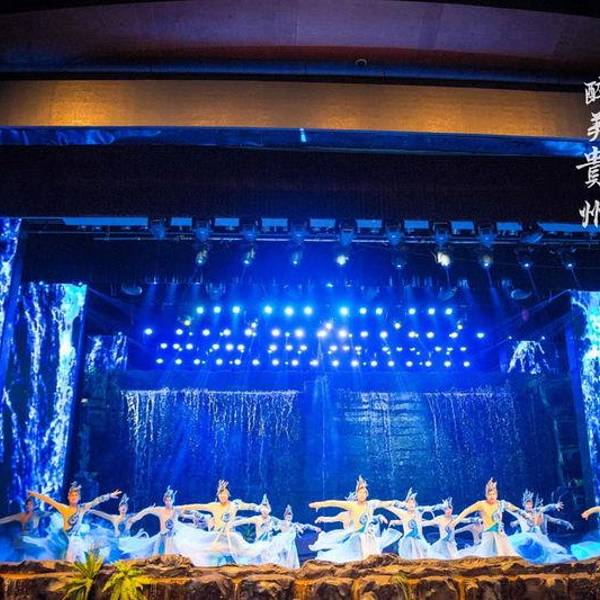 《多彩贵州风》是贵州的大型民族歌舞诗,如果通俗一点,就是一台大型歌舞类民族风情秀。其实本来觉得这些民族的歌舞很老土,结果好像比我想得好多了,一开始就有很多穿着民族衣服的姑娘们早早站到了剧院的大厅当中,好像还挺热闹的,很注重于观众互动的环节,表演各种挺有趣的歌舞。主持人满幽默的,经验丰富。表演一个半小时的时间内,展现了苗族,侗族,布依族,彝族,土家族等各个民族的风情和黄果树、茅台酒等贵州特色,既有漂亮妹子汉子唱歌跳舞,又有苗族勇士上刀山,还有和现场观众的互动环节,整场演出高潮不断精彩纷呈,让游客们迅速领会到了贵州旅游的精彩。她的舞美非常精美、灯光非常诗画、服装非常绚丽、音乐非常动听、舞蹈也非常有特色,构成了贵州山水、自然和人文的互相交融,旅游和文化的互相结合。