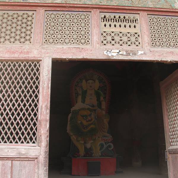 阁院寺在辽代及以前的样子我们已经不得而知,院子里,大雄宝殿只剩台基,文殊殿内的佛像早已不知所踪,墙上的壁画,在近年的整修中被糊上。殿中文殊铜铸塑像很新,据说之前这里就挂了一幅画。