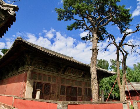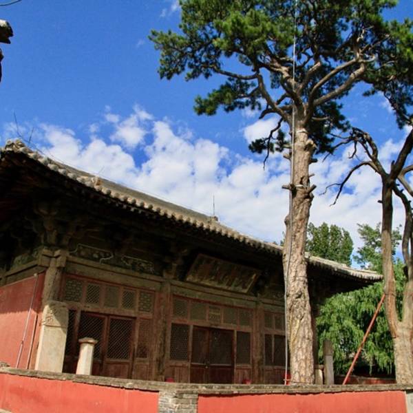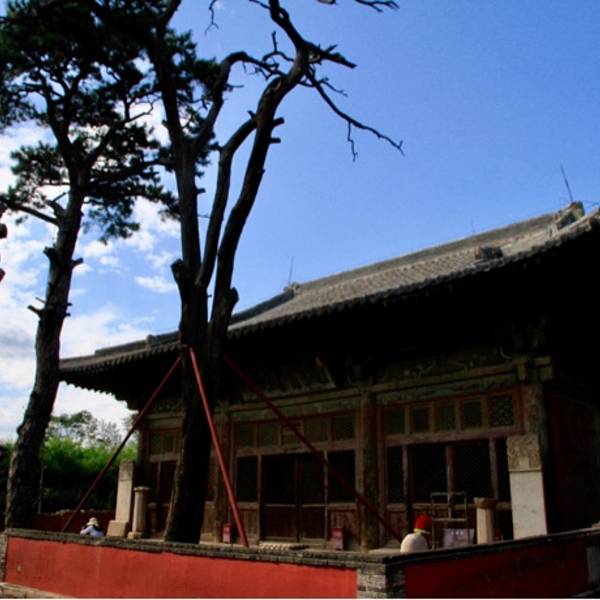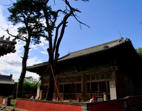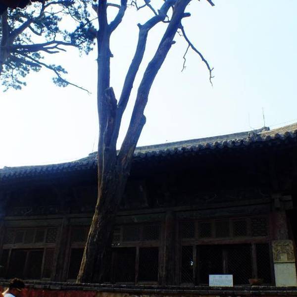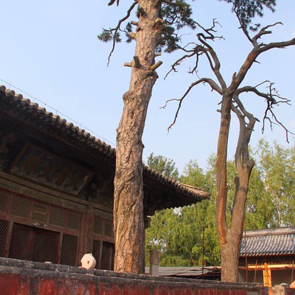 文殊殿前原有两棵松柏,据看护人讲,其中一棵因为经常有人在树下倾倒洗照片的洗剂而在多年前枯死。