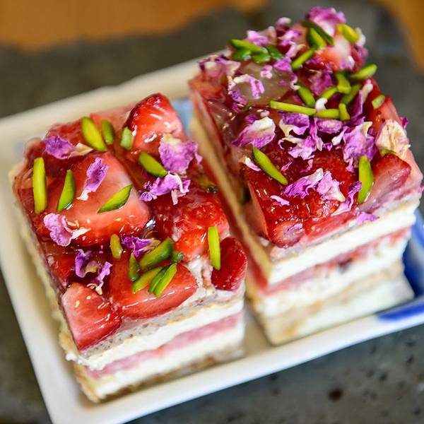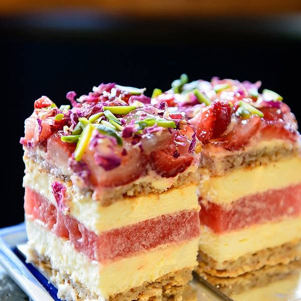 这家店最出名的是草莓西瓜蛋糕,它不是简单的西瓜口味的蛋糕,最上层是新鲜的草莓镶嵌在酸甜的草莓玫瑰啫喱里,铺陈大量干玫瑰花瓣,每一口都吃得到喷香的玫瑰味道,同时撒有充满春天气息的嫩绿色开心果仁碎,不...这家店最出名的是草莓西瓜蛋糕,它不是简单的西瓜口味的蛋糕,最上层是新鲜的草莓镶嵌在酸甜的草莓玫瑰啫喱里,铺陈大量干玫瑰花瓣,每一口都吃得到喷香的玫瑰味道,同时撒有充满春天气息的嫩绿色开心果仁碎,不同于一般的奶油蛋糕采用海绵蛋糕做夹层,西瓜蛋糕的夹层是法式杏仁蛋白饼,一层法式杏仁蛋白饼一层鲜奶油一层冰爽西瓜,这是一块口感极为细腻的蛋糕,颜值味道都在线