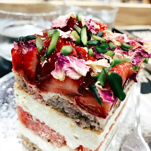 - 但是這個蛋糕口感層次豐富,用草莓做成果凍口感,緊接著類似蛋撻口感的,當然有一層餅幹底,一層奶油...