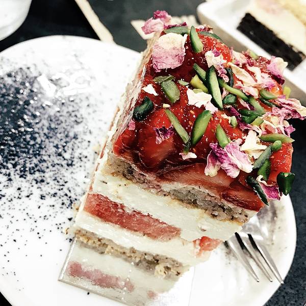 Black Star Pastry因为创新推出的草莓西瓜蛋糕而风靡网络,成为悉尼的一家网红蛋糕店。原来只有一家,现在已经开了三家了,但据说来晚了还是会经常卖光。我们去的是Newtown这家,店面很小,所以食客们都坐在外面椅子上排成一排吃,这种轻松接地气的氛围很符合我的胃口。这就是网红的草莓西瓜蛋糕了,一块蛋糕分了六层,中间一层红色的是西瓜肉,最上面是满满的鲜草莓和玫瑰花。吃蛋糕的时候一定要一勺到底,全部放进嘴里,然后尽情享受多层次的味道和口感带来的愉悦。整款蛋糕甜度不高,饱含汁水的西瓜带来新鲜水果的清新,感觉确实很奇妙。店里还有很多其他款式的蛋糕等着大家去发掘, 比如荔枝的、开心果的、巧克力的。