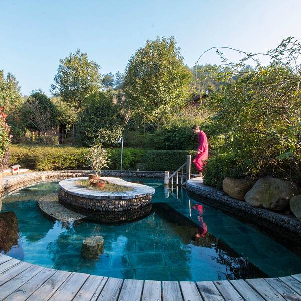 在金华玩的最后一个游程,本想去见识一下武义的温泉,但本地人说起这个九峰温泉,觉得少了舟车劳顿也可以啊在金华玩的最后一个游程,本想去见识一下武义的温泉,但本地人说起这个九峰温泉,觉得少了舟车劳顿也可以啊。到了感觉不错,大池都是室外的,温度在40左右,工作日人少,静心赏景观。