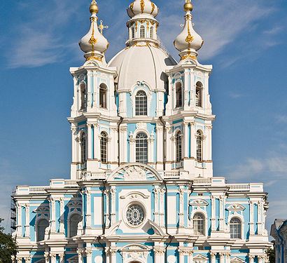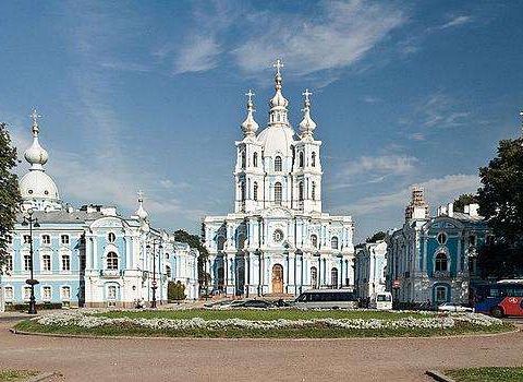 斯莫尔尼大教堂位于斯莫尔尼宫中,即使在远处也可以望见它的尖顶。大教堂和它周围的建筑号称是俄罗斯最美的巴洛克建筑,今天这里经常举办音乐会。