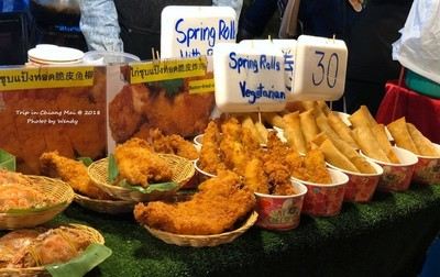 从周日夜市逛到周六夜市,圆满了。 周六夜市在清迈门那边,又是一个超级大夜市。相比周日夜市,更喜欢周六夜市,因为吃的东西多很多。出清迈门就是一大片美食摊位,然后夜市一路上又有几个区域有吃的,真正的逛吃逛吃。