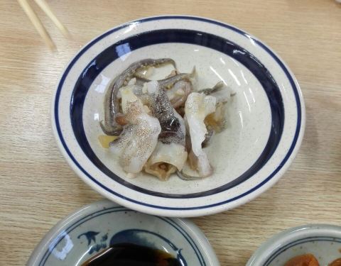 离开函馆的最后一餐,想到无论如何也要去体验一下,吃活蹦乱跳的生猛海鲜的生鱿,就去了位于横丁市场一楼的这家特色小店。小店也不小,有两层楼的店堂,一楼满座我们就上了二楼。点好活乌鱼 海鲜饭和生蚝。海鲜饭太有特色了,一支活墨鱼放在饭上面端到面前,向墨鱼上淋上些酱油,它就开始每根鱼须快速舞动起来,这时考验食客胆量的时候到了,看你敢不敢用筷子把它送入口中。用力咬了几下,好不容易才咬下一根须来,这时店员过来帮忙用刀将鱼切小以方便食用。鱼头脆生生的还真心好吃。另外生蚝生吃口感也好味也鲜美,有胆量的同学值得一试。