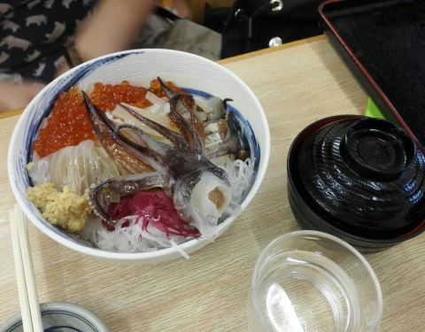 海鲜盖饭专门店,招牌菜“活いか踊り丼”(活跳跳鱿鱼丼)是函馆名物,许多游客慕名而来。每碗盖饭上面有一只很大的活的鱿鱼,店家特意摆放成张开的样子,倒上一点酱油,鱿鱼的脚还会动,像跳舞一样。如果整只放入口中,会感觉有吸盘在嘴里黏住,非常弹牙。如果不敢整只食用,也可以叫店员来把它切开处理一下。