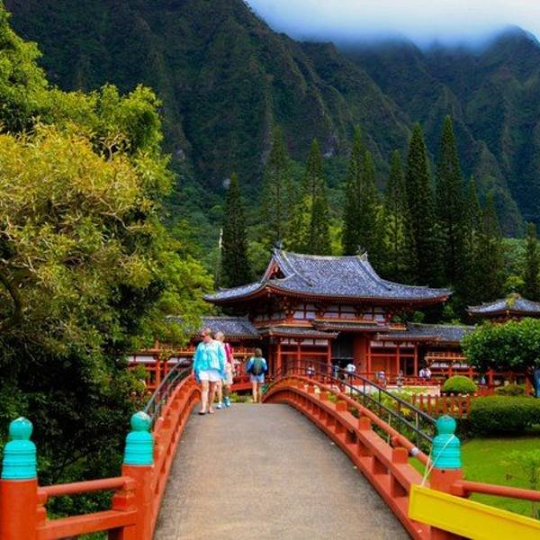 神庙谷隐匿在迎风海岸的深处,坐落在柯劳山脉的葱郁山谷里,是许多夏威夷人的安息之地。这里安葬着不同教派的人士,著名的平等院也坐落于此,它是模仿日本京都府的拥有900年历史的寺院而建的。寺庙的墓地有着完美的对称结构,代表了日本平安时期的经典建筑风格,象征富裕的朱墙在山脉青翠峭壁的映衬下显得尤为漂亮。9英尺高的佛像位于寺庙的主厅之中,全身贴满金箔,而其所处的位置也恰巧能够迎接清晨的第一缕阳光。庭院外,野生孔雀在鲤鱼池边悠闲散步,别具一格的花园则象征着阿弥陀佛的极乐净土。你可以在进入寺庙前敲一下圣钟,深厚低沉的钟声在佛寺里回荡。