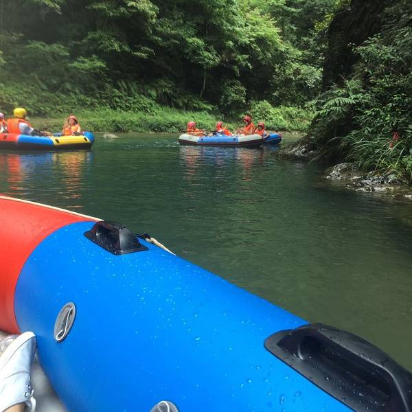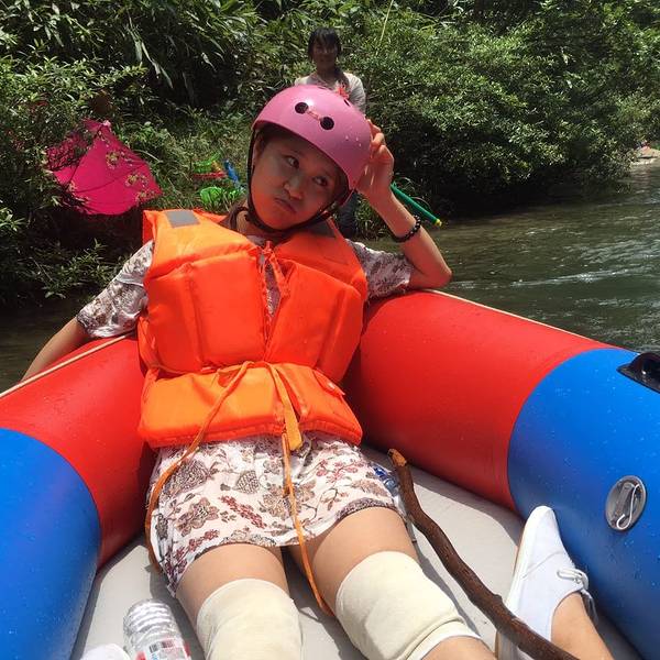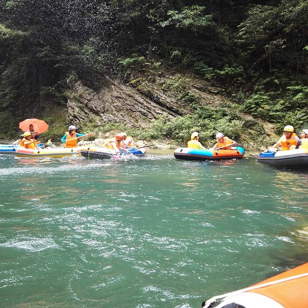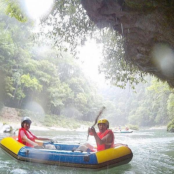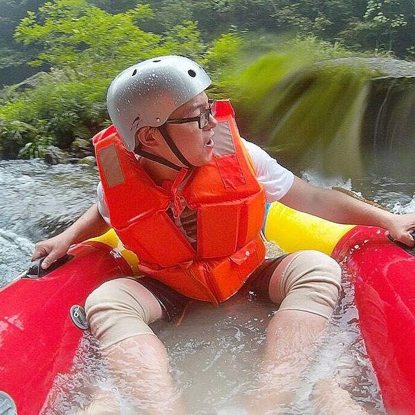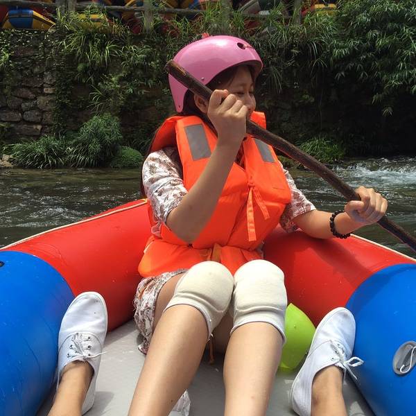 换好设备之后,会坐大巴,有一段盘上路上到山顶开始漂流,漂流之前会分组,然后会一个船给一个长木棍,到水里掌舵用,另外如果你不会游泳,搭档最好选一个会游泳的,这样不光心理上有一些安慰,在水中也会真的安全一些。门票大概一百多不到两百,沿途都有护航员保护你的安全,只要下坡的时候手不松,身子不往前倾,一般是不会翻船的,我和小伙伴友谊的小船没有说翻就翻,只不过我在中途直接抛下了他哈哈哈