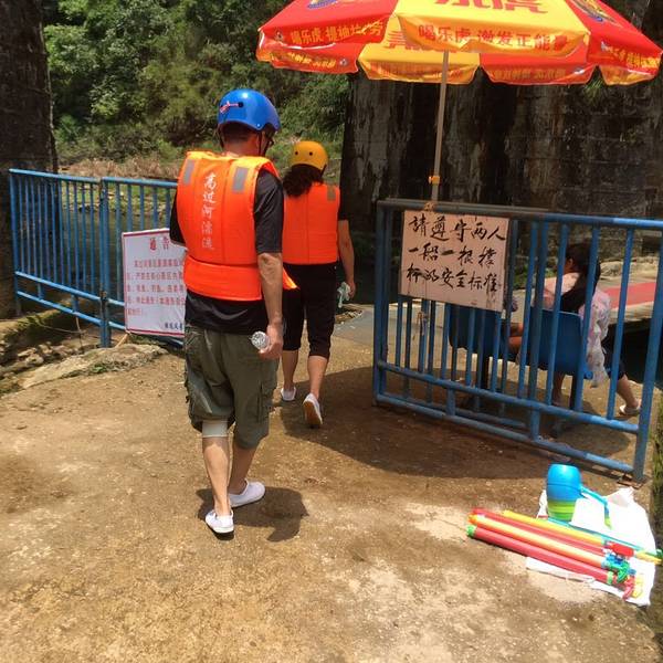 来说说装备,买好票之后,旁边有头盔,护膝等,拿好自己的尺码去换好,一定要带,鞋子也是提供的小白鞋,也可以穿自己的凉鞋,还有一些商铺再卖雨衣防水衣等,其实穿泳衣更方便哦。