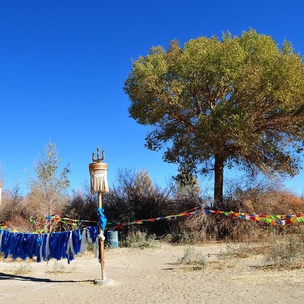 在额济纳567万亩的天然胡杨林中,生长着一棵被当地人称为“神树“的胡杨树。这棵“神树”位于额济纳旗达来呼布镇以北25公里处,树龄达880年。神树高23米,主干直径2.07米,需6人手拉手才能围住,堪称额济纳胡杨树之王。按照当地蒙古民族习俗和原始宗教,神树被赋予神秘的色彩,是当地老百姓祭祀苍天神灵的附载物。每到冬末初春,远近牧人便虔诚地来到“神树”前诵经祈祷,祈求风调雨顺,草畜兴旺。在这棵千年“神树”周围30米内,又分生长出5棵粗壮的胡杨树,牧人们把它们叫做“母子树”,远远望去颇为壮观。神树作为额济纳胡杨林最为典型的景观,已经成为胡杨林的标志和形象。凡到额济纳旗观赏胡杨奇景的中外游客都要到神树之下一睹其壮观、奇秀的尊容。