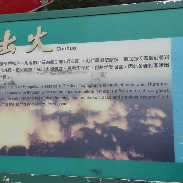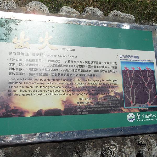 实用 ...奇特的自然现象景点,白天很热很晒看不清楚火苗,爆米花的同时在烤人肉,建议要去的话还是晚上去好了台湾垦丁半岛沿线的景点中,如果走环线比较远的景点就是这个出火,这个地方属于小景点,要不是看到有停车的位置,不少游客驾着机车慢慢停下的那一刻,我都不清楚到了哪,再看看卖椰子的小摊,回头一看才看到了出...台湾垦丁半岛沿线的景点中,如果走环线比较远的景点就是这个出火,这个地方属于小景点,要不是看到有停车的位置,不少游客驾着机车慢慢停下的那一刻,我都不清楚到了哪,再看看卖椰子的小摊,回头一看才看到了出火自然景观几个字,拿个地图一看,原来踩了那么远的路才到终于到了这个景点。实话说,这个景点挺让人失望的,如果不是时间太多的话,建议还是别来了,很远,开车适合,驾机车也不太合算。我们来的时候是白天,很多人都买了个爆米花在这里烤爆米花。出火其实就是地下冒出来的天然气口,这里长期喷出的天然气形成的火苗成为了一个游客少见但比较奇特的自然现象景点,白天很热很晒看不清楚火苗,爆米花的同时在烤人肉,建议要去的话还是晚上去好了。 展开