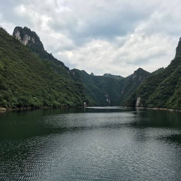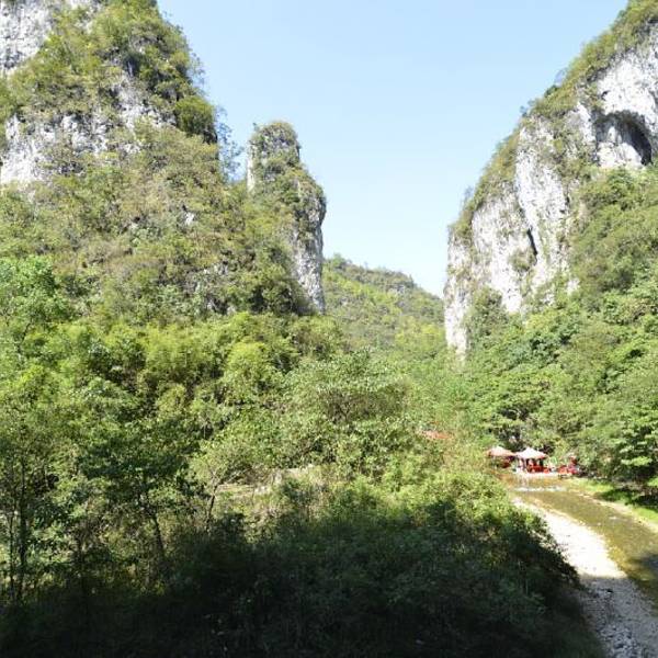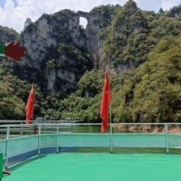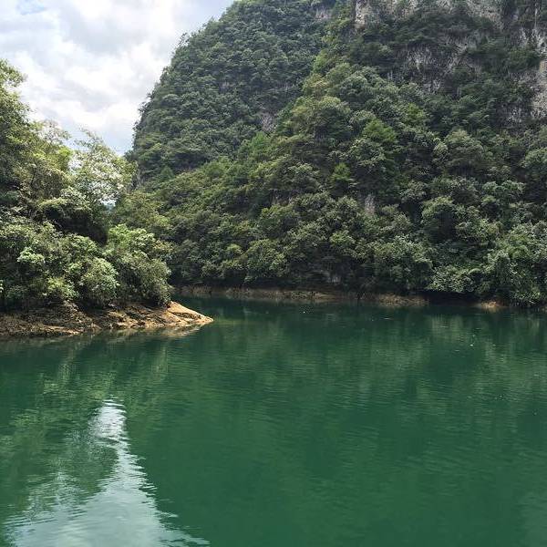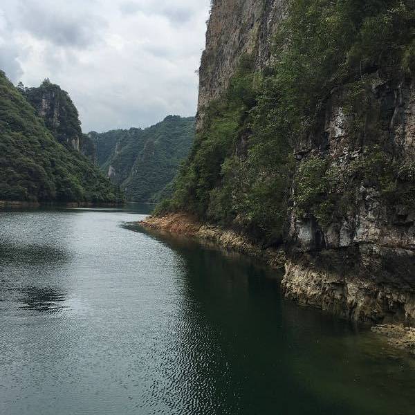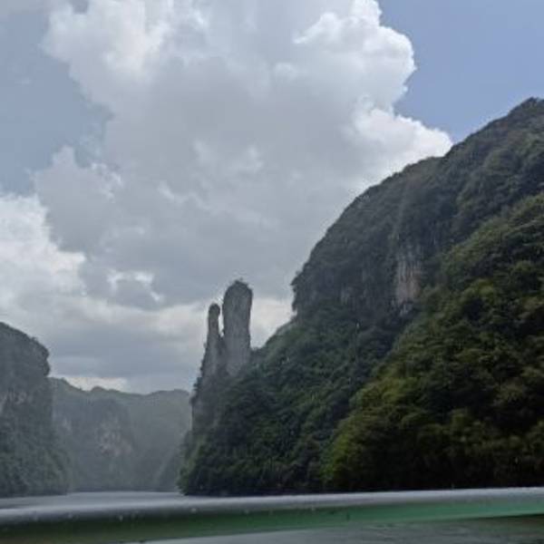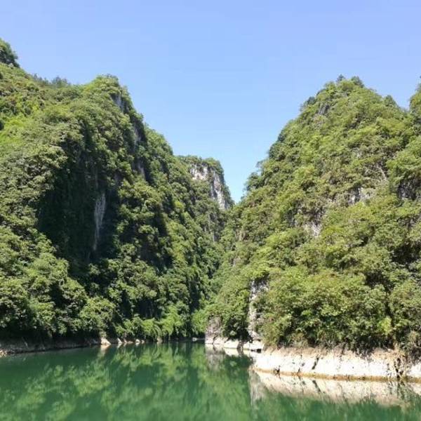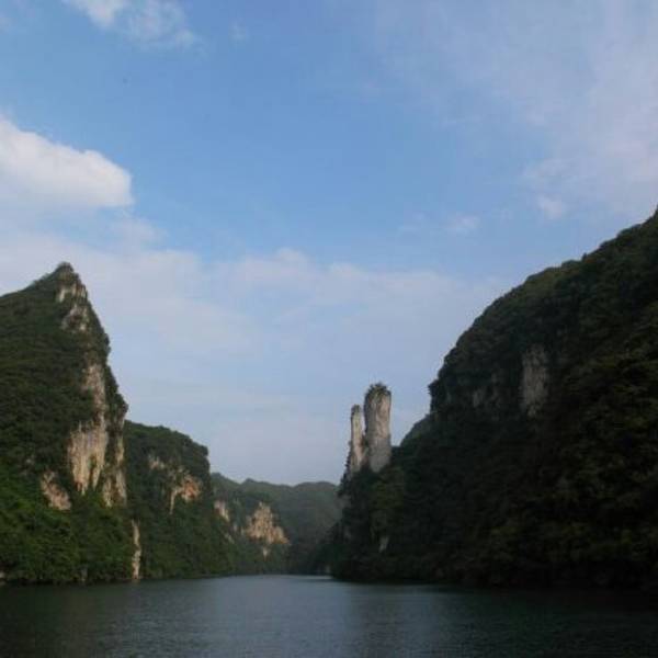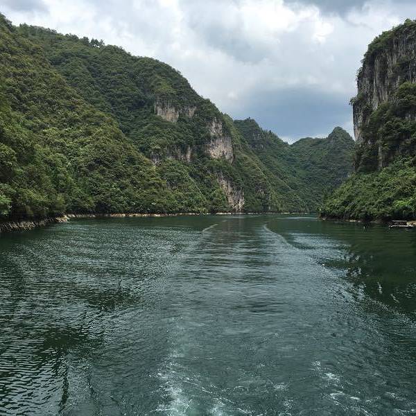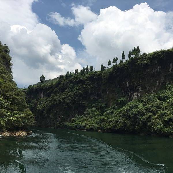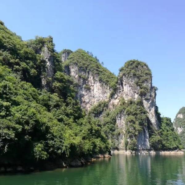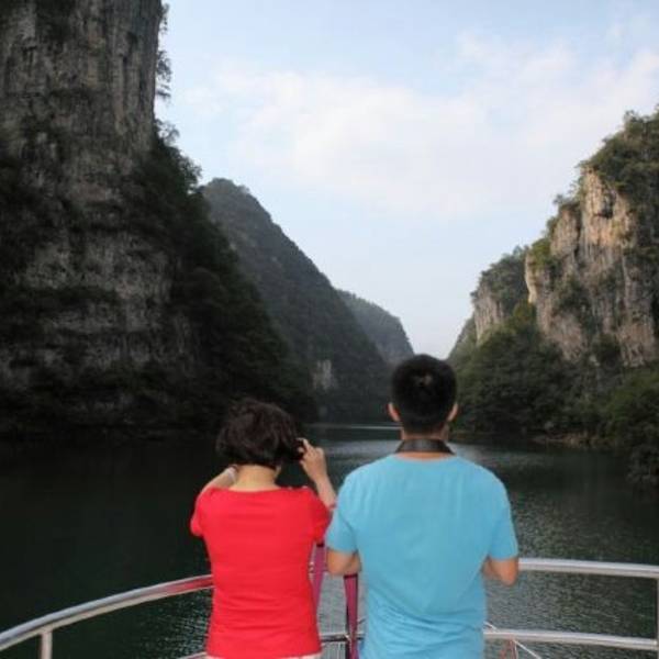 乘船顺流而下,峡谷中空气清新,两岸奇峰林立,令人心旷神怡。