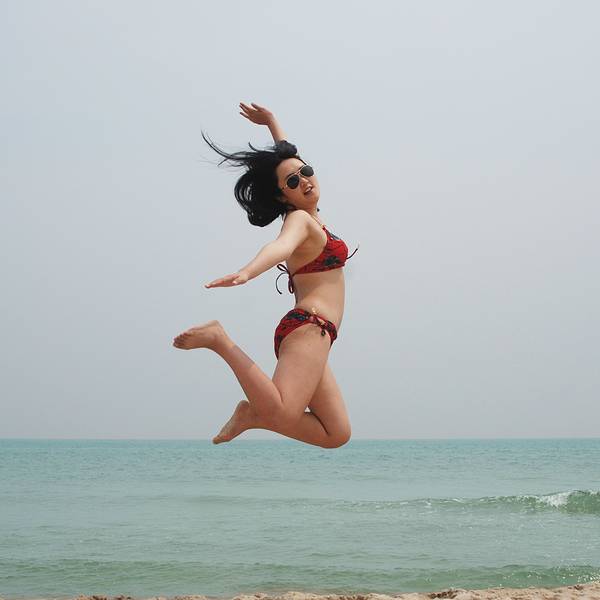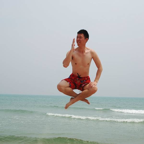 去哪里都要留下一个超级玛丽跳。早晨的海滩人少少。此图有亮点。太阳没出来,海水还是很凉的