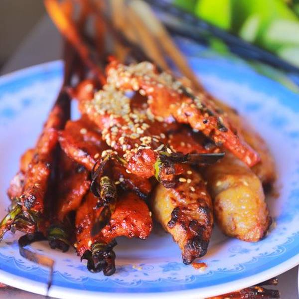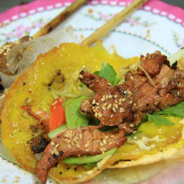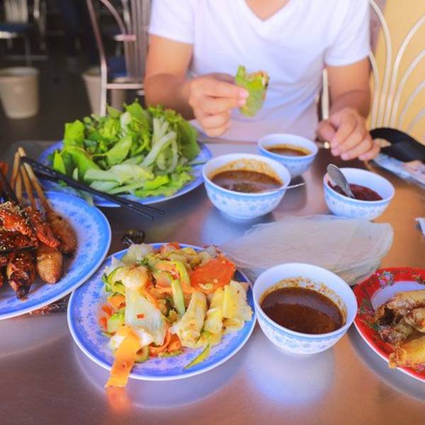 地方不太好找隐藏的小巷子里面。很多老外慕名而来~店内只提供一种套餐,里面有一份烤猪肉(有大块烤猪肉和烤猪肉条),一份炸春卷,一份鸡蛋煎饼(可以单独吃也可以包着材料吃),一份米皮,一盘杂菜,一份泡菜,各种酱料。套餐不含饮料但你吃完后会给你布丁!!有芒果味和巧克力味。一人一个套餐110000VND,约合人民币33元。食肉兽/烧烤兽/饭量大的一定要去好吗,套餐分量足吃完很饱。店员会告诉你怎么用超薄的米皮包着材料吃,这种包法实在太好吃了,那盘杂菜我吃不习惯。。没有加进去。烤猪肉非常香,味道很好!用米皮把春卷,烤猪肉,泡菜,杂菜,酱料包住,张大嘴巴咬一口,超级满足!不用米皮用鸡蛋煎饼包着吃,也很赞!