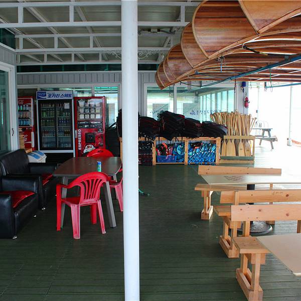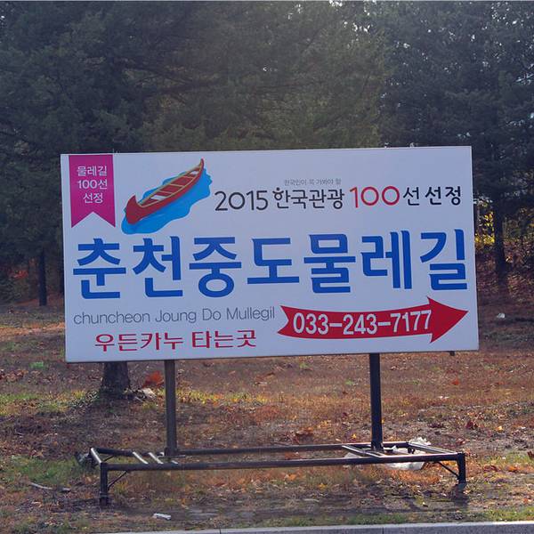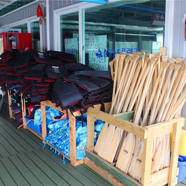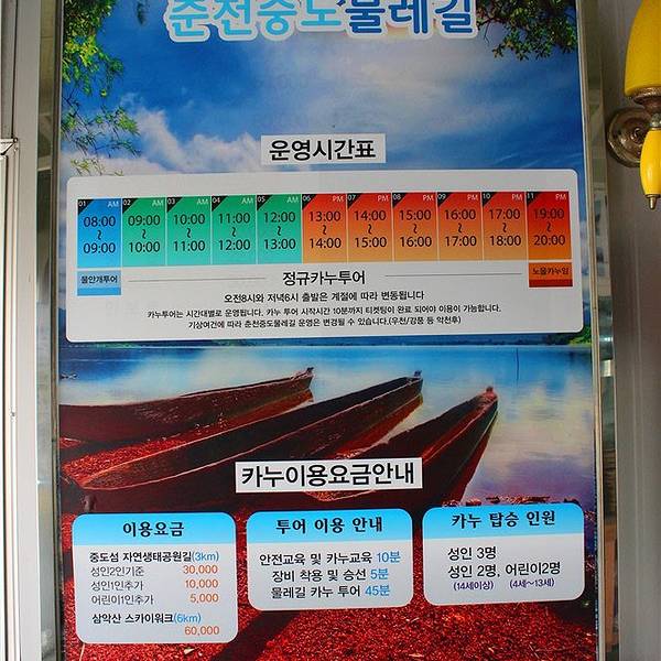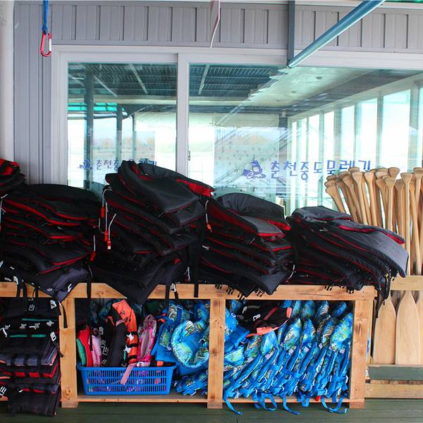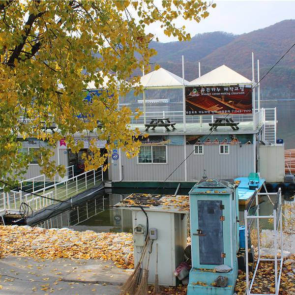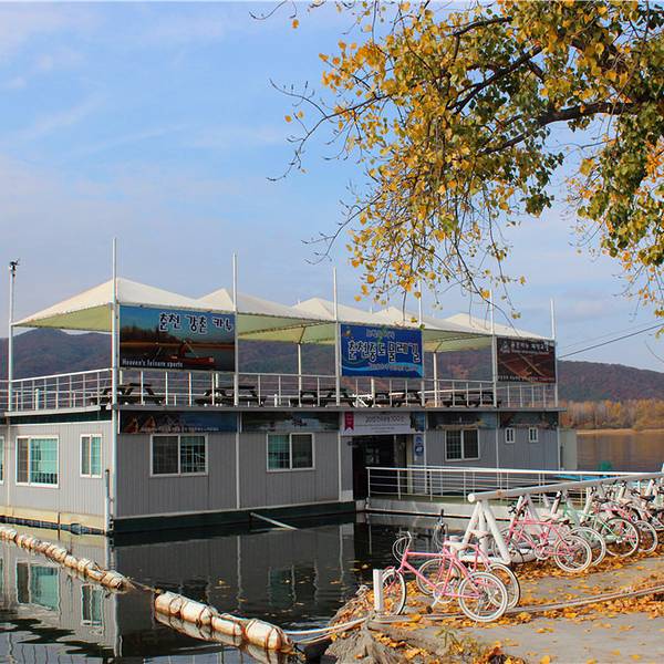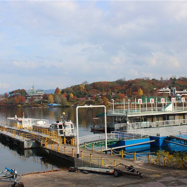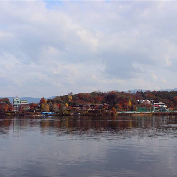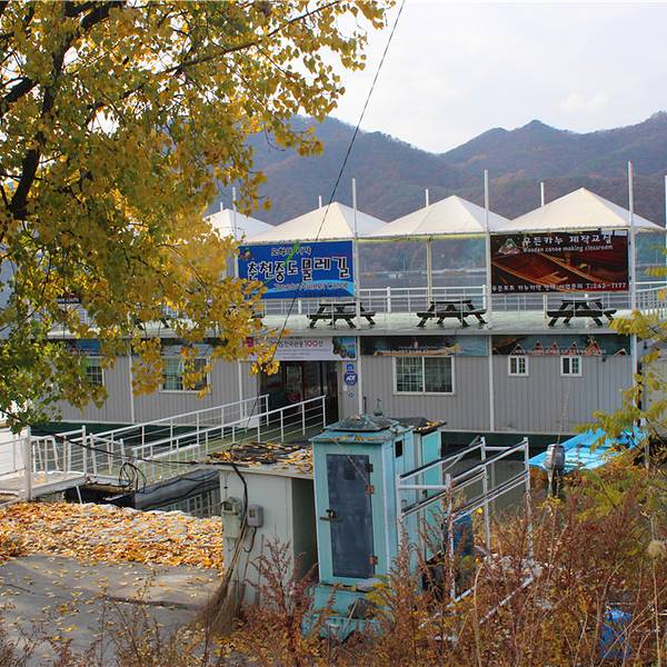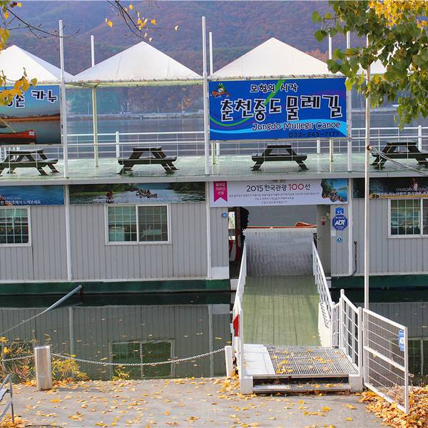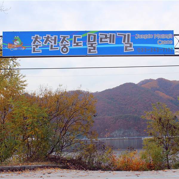 怕水的小朋友只想静静的看看风景~~ 春川义岩湖的风景非常美,这个划艇水道就是在这个湖中,房子也是在水上的,这里还曾经被评为韩国旅游景点前100.很多综艺节目都在这里取景过,中国人很熟悉的 running man 就在这里拍摄过。 冬天的时候这里人很少,夏天是最多的,排队就要好久。尤其是天气燥热的时候,玩水的活动最有人人气了。这里有教练指导的,所以不用有任何负担。 这里的交通不是太方便,最好的方式就是在春川站或者南春川站乘坐春川旅游巴士,5000韩元就可以,而且玩结束后还可以免费乘坐这个大巴到其他景点。如果自己过来就比较难,当然从春川站步行过来是可以的,需要30分钟左右,但如果懒得走,从南春川站打车也得需要8000韩元左右,所以还不如乘坐循环旅游大巴了,直接到门口下车。 这附近没什么人,所以车站也是循环巴士专门建的。另外,公交车也是可以,需要步行一段时间到前面的春川乘马场站上下车,公交间隔时间120分钟,有点久。这附近很多这种体验水上活动的设施。我是从春川的想象空间步行过去的,沿途很美。大约15分钟,就走到了水上划艇水道。平日人少的时候,划桨都会被这样的正好,我去参观的时候工作人员很好,可以允许我随便看看,因为我一个人不想滑水,秋景又很美~