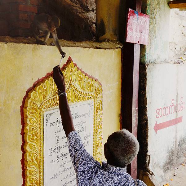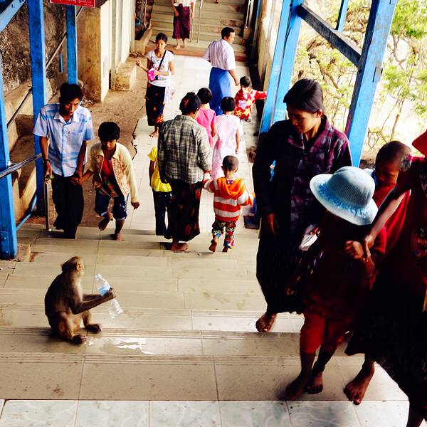 普帕山: 在中国人眼中,它有另外一个名字叫做:空中修道院 在当地的旅行社定了中午去空中修道院的车 10000k/人 一个面包车直接来酒店接 空中修道院也许是中国人自己给取的名字吧,当地叫Popa Taungkalat monastery 给老板讲popa 就基本都知道了 这个地方里蒲甘有50公里,算是比较遥远的景点,因为坐车需要1.5小时之久。 下午,司机把我们带到一个观景台的地方,可以看见一个悬在空中的寺庙,只是早上来的话,顺光看起效果要好些,下午是大逆光。据说popa山是一座火山,这里也是被认为 是缅甸最强大的神灵居住的地方,每年5月,6月,11月,12月 满月的时候,大家都会到这里才朝拜。山上猴子非常多 不过 必峨眉山的要温柔许多这就是上山的台阶 和我们一起来的,还有一个日本人 是我们一起坐车来的 不知道是不是所以日本人都有洁癖 因为上山路上 很多猴子,所以上山的台阶就自然布满了各种猴子的排泄物…… 上山是要求把鞋脱下,光脚上山的,所以…… 小日本就这么一路掂着脚上山了……痒!!痒就捞呗!!!小日本 给我们拍的合影大师兄猴哥 该回家啦一组漂亮的剪影 猴哥们蒲甘大地,每一天都是这么美