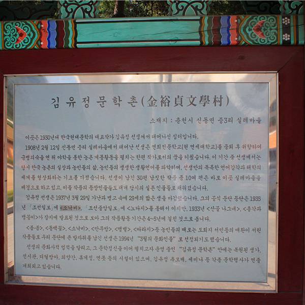 作家金裕贞(1908~1937)是光复前朝鲜文坛上才华横溢的中坚作家,韩国短篇小说的代表性作家。其故乡春川市新东面的故居被复原后改建为展示馆,故居所在村落成为“金裕贞文学村”吸引了游客们的脚步。文化村自然景色优美,适合散步、登山等的休闲空间丰富。金裕出生后,就搬到首尔住,1931年23岁时才返回故乡,此后两部农村题材作品《山谷那边》、《冬柏花》等小说都是在此诞生的。金裕贞文学村纪念馆内,还保留着旧时的磨坊等作家出生时的物件,并通过各种形式和手段再现了小说的内在世界。